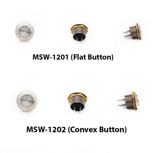 MSW-1201 12mm 平按鍵不銹鋼按掣 MSW-1201 12mm 平按鍵不銹鋼按掣OFF-(ON) SPST. Rating: 16V 50mA. 12mm Mounting Hole